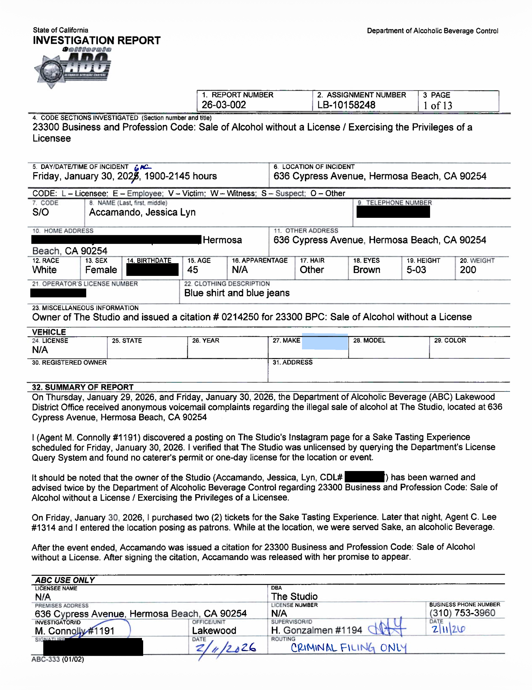 Authorities said 'The Studio' owner Jessica Accamando hosted a Sake Tasting Experience on Jan. 30, 2026, at the unit located at 636 Cypress Ave.