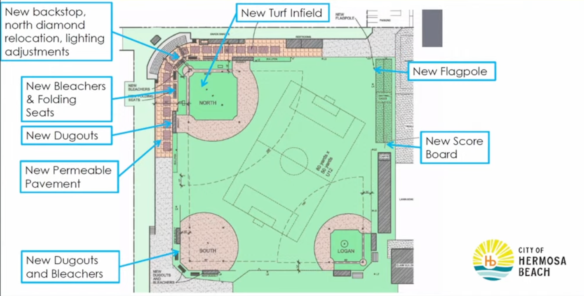 The proposed improvements, which Little League representatives say would be fully self-funded through a fundraising campaign, include a new synthetic turf infield, a redesigned backstop with the potential to shift the northern diamond slightly northwest, new bleachers, upgraded lighting, permeable pavers along the loop road and a new scoreboard. Little League has agreed to cover all associated city staff time and plan check fees.