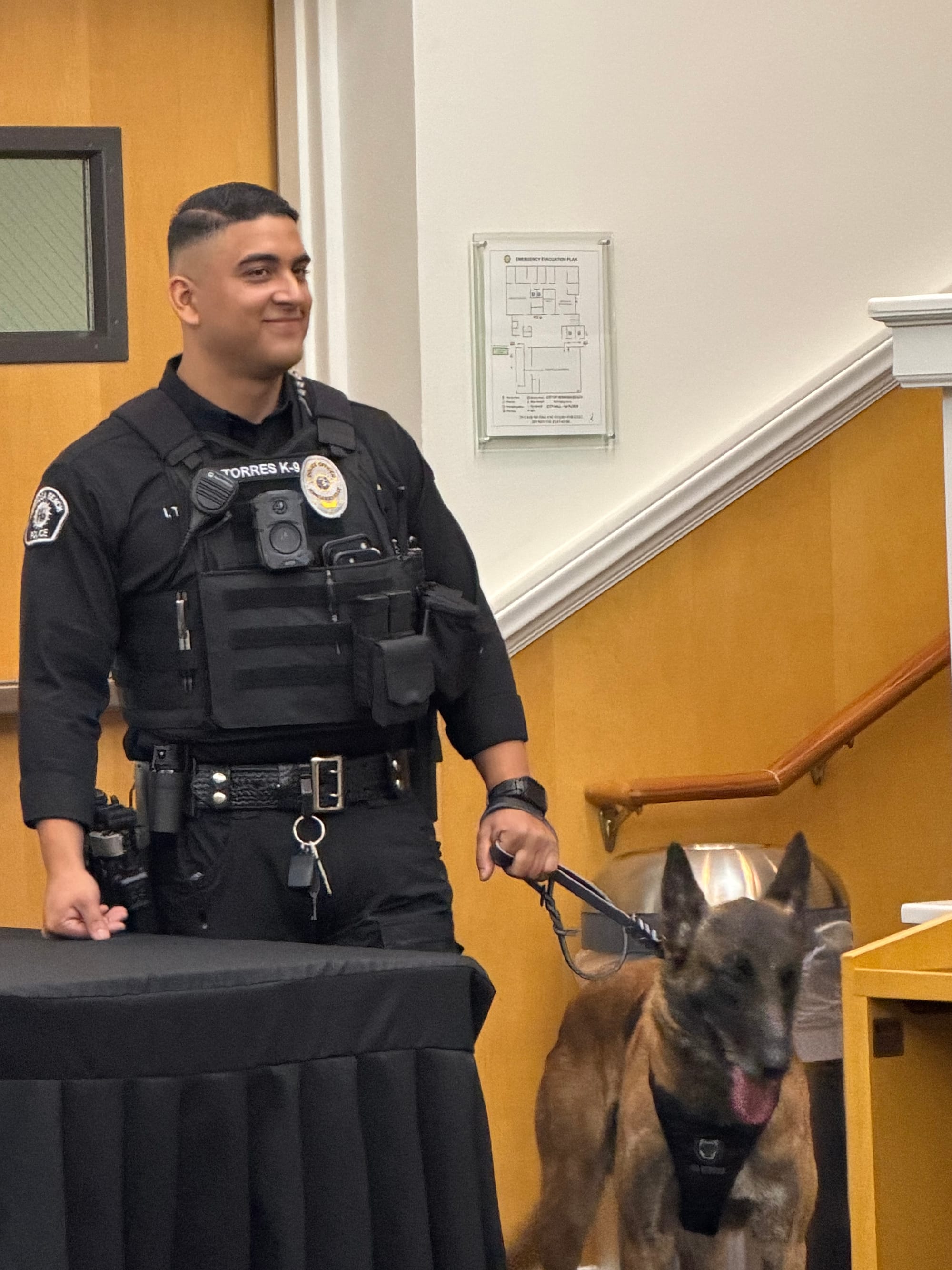 "Arco holds a KMPV title, which is a prestigious title from the Royal Dutch Police Association, which emphasizes in control and apprehension," Officer Ivan Torres, Arco's handler, told the City Council. "Prior to arriving in Hermosa Beach, Canine Arco already established an elite standard in police work."