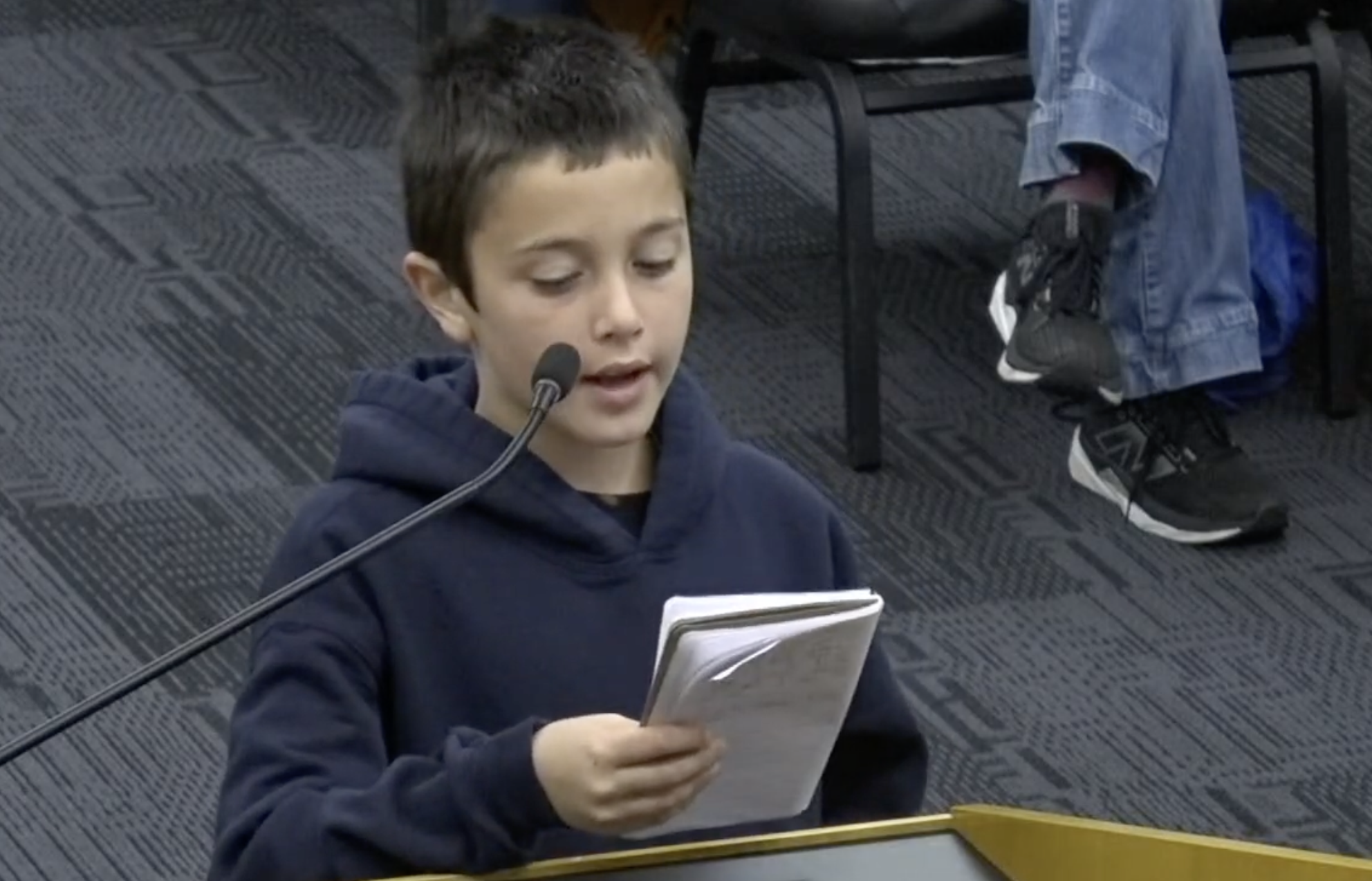 10 year-old Elias Brafman LaMonica giving his side of the hoops story during public comment last night