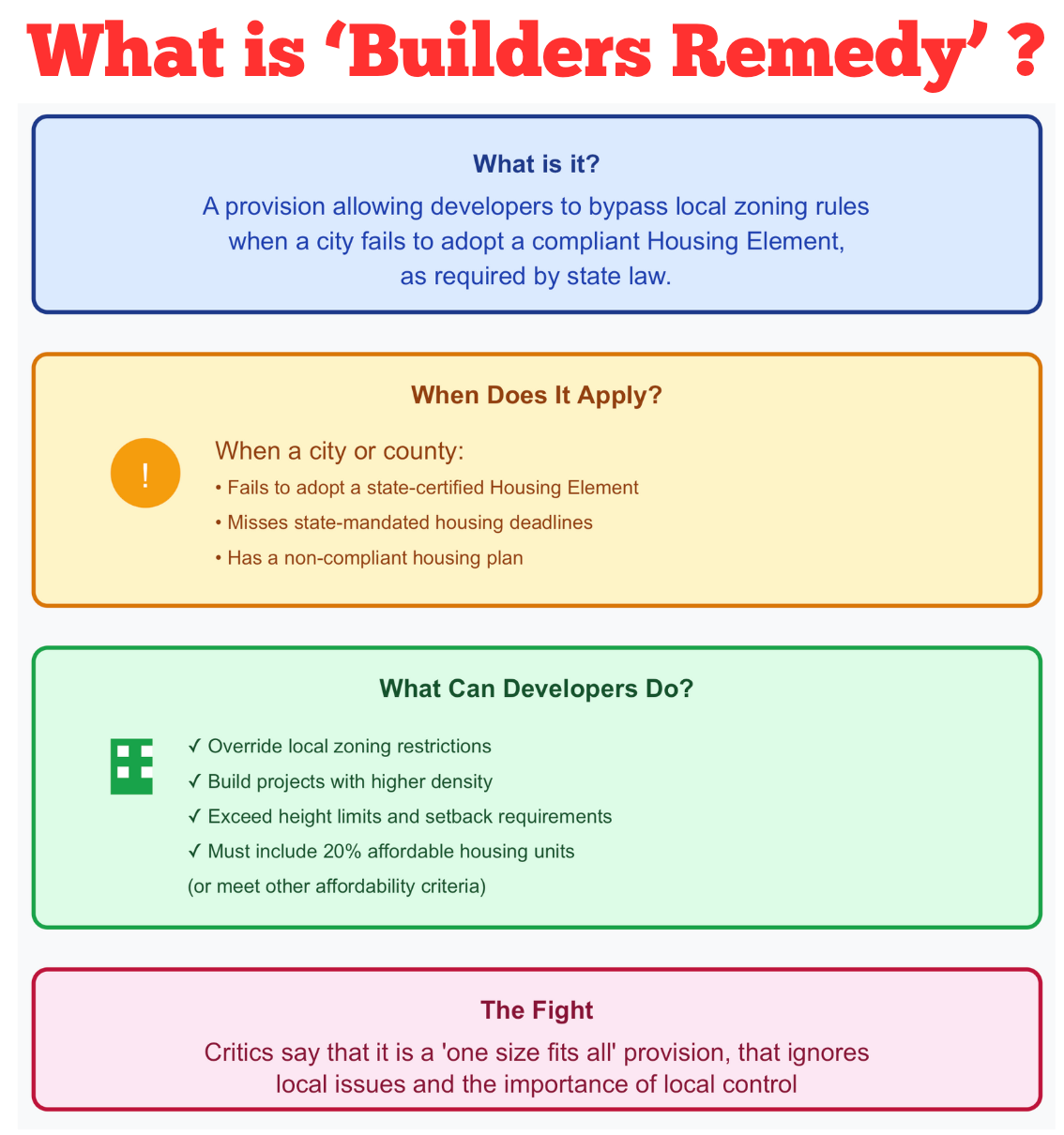 The "builders remedy" sounds like bureaucratic jargon, but it's actually a powerful stick the state uses to force cities into compliance with housing laws. When a city doesn't have an approved housing plan, developers can bypass local zoning entirely—as long as they include some affordable units.