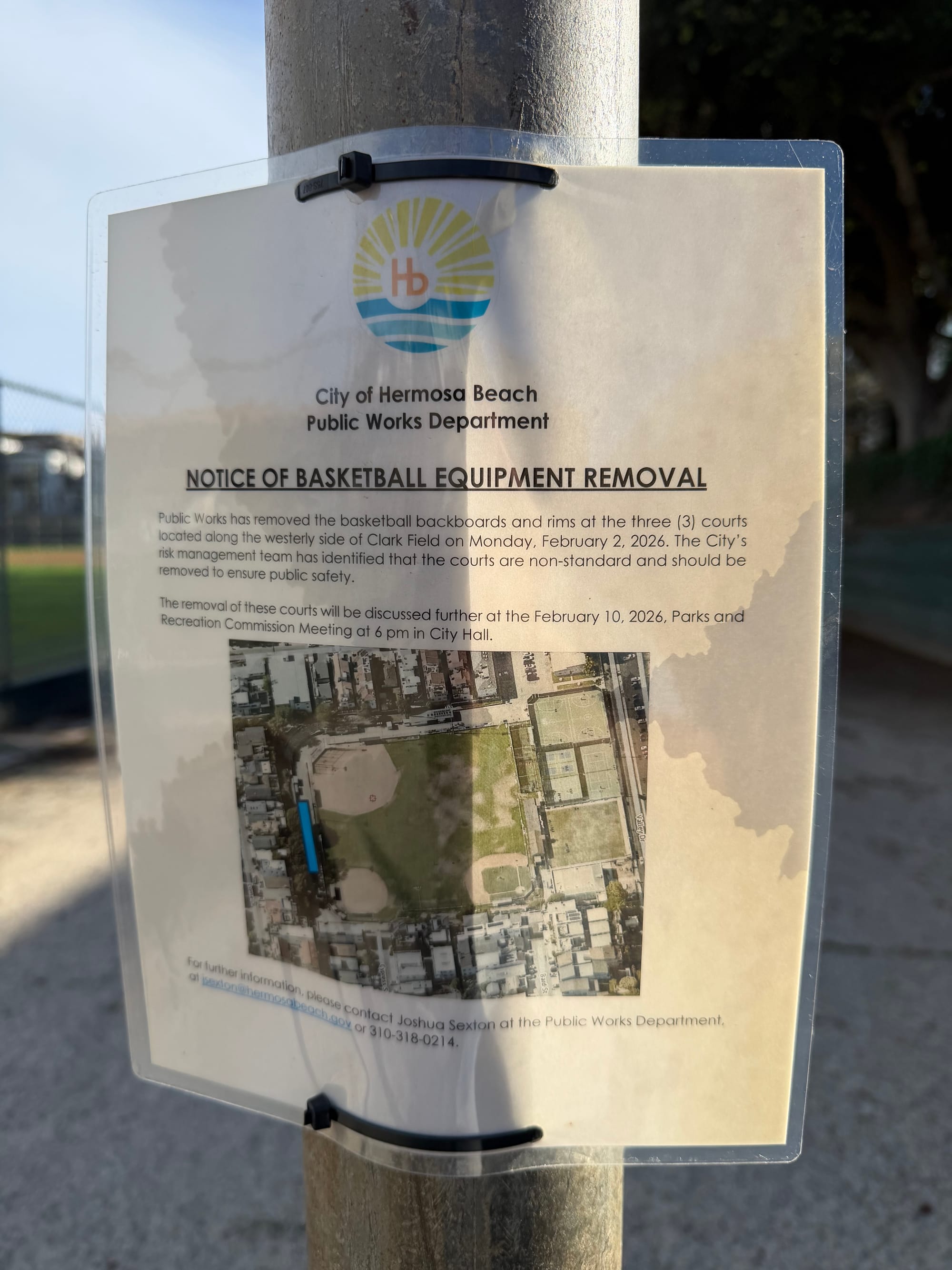 On February 2, Public Works crews removed all six backboards and posted notices directing the public to the February 10 Commission meeting. The removal happened eight days before the Commission discussed the matter. As The Hermosa Review reported at the time, the move caught the neighborhood off guard and generated a 450-signature petition in less than a week.
