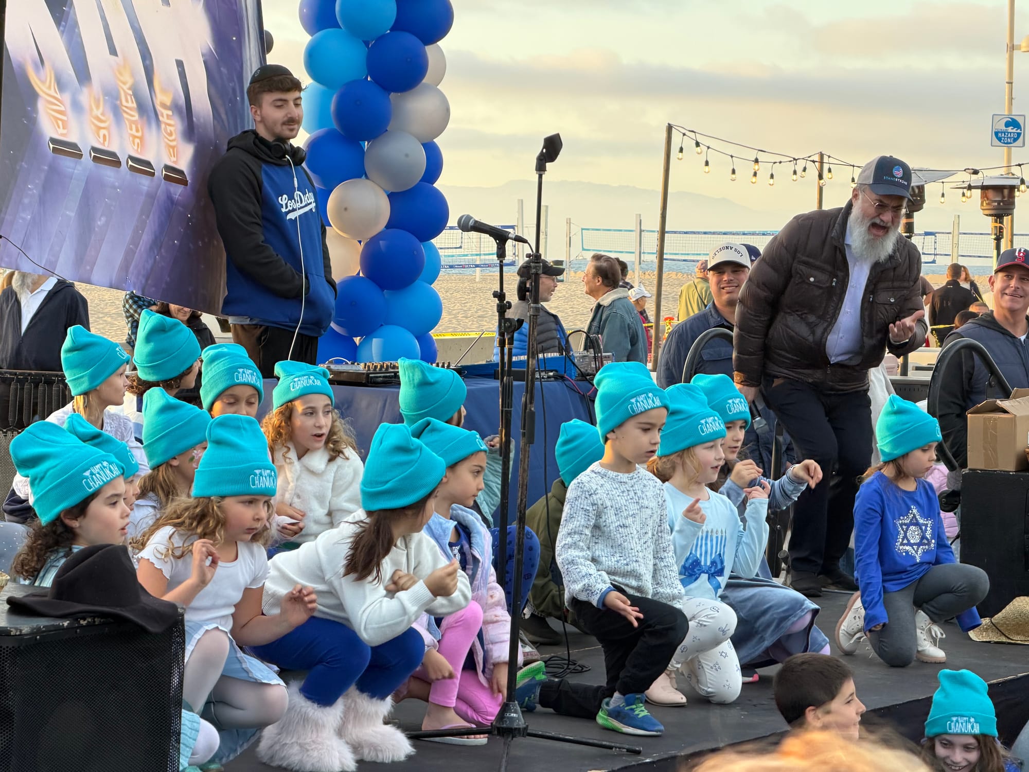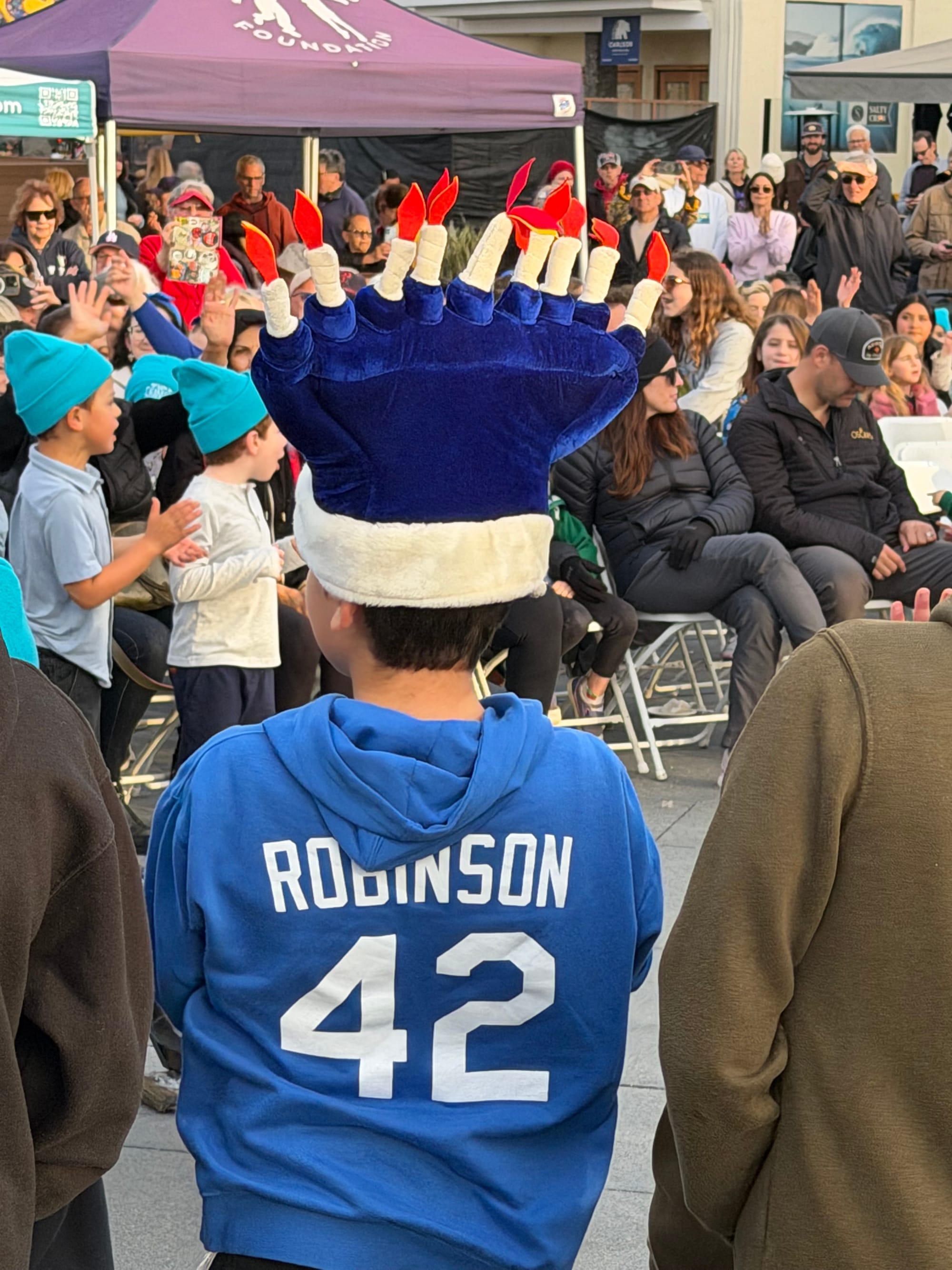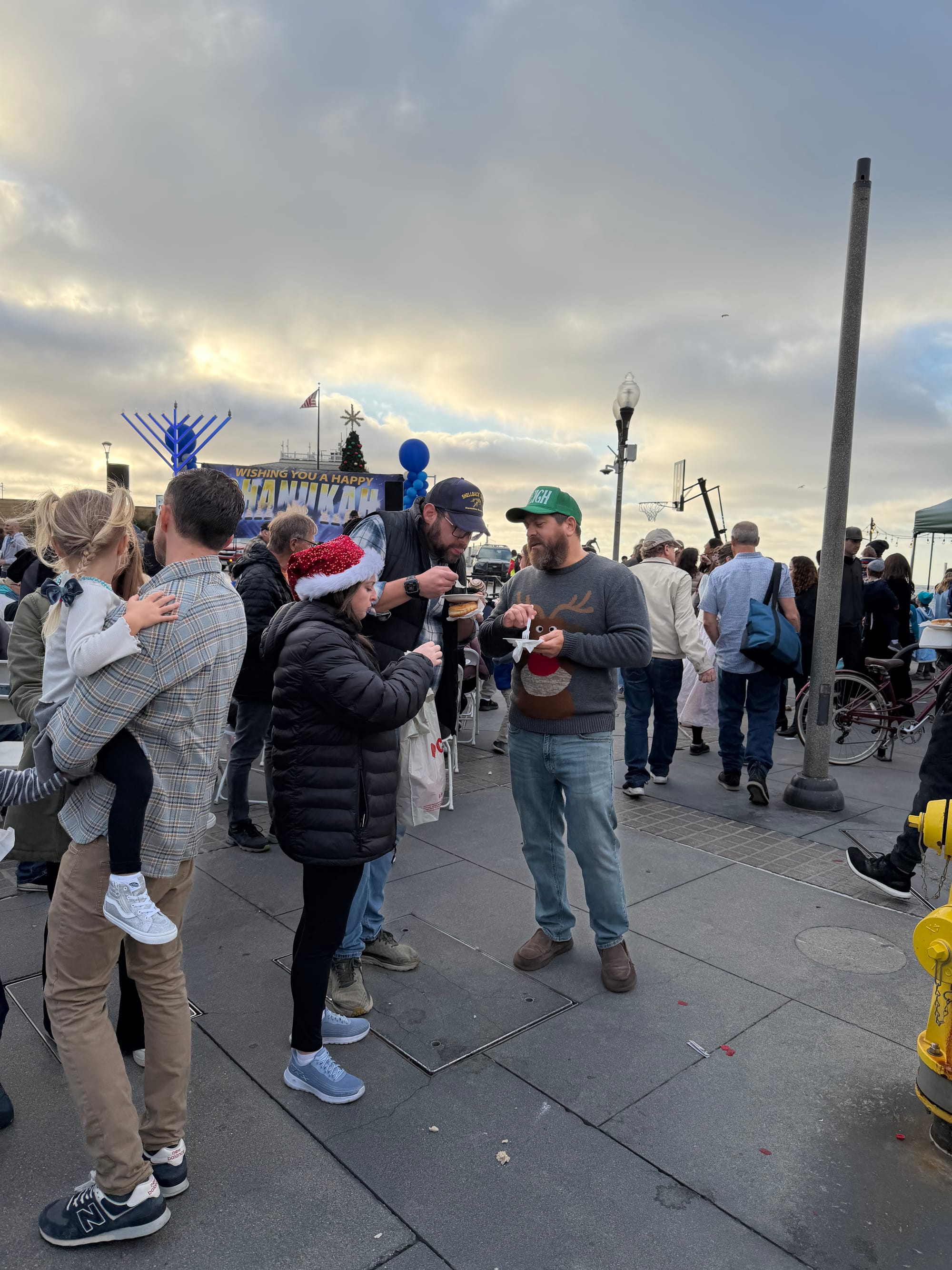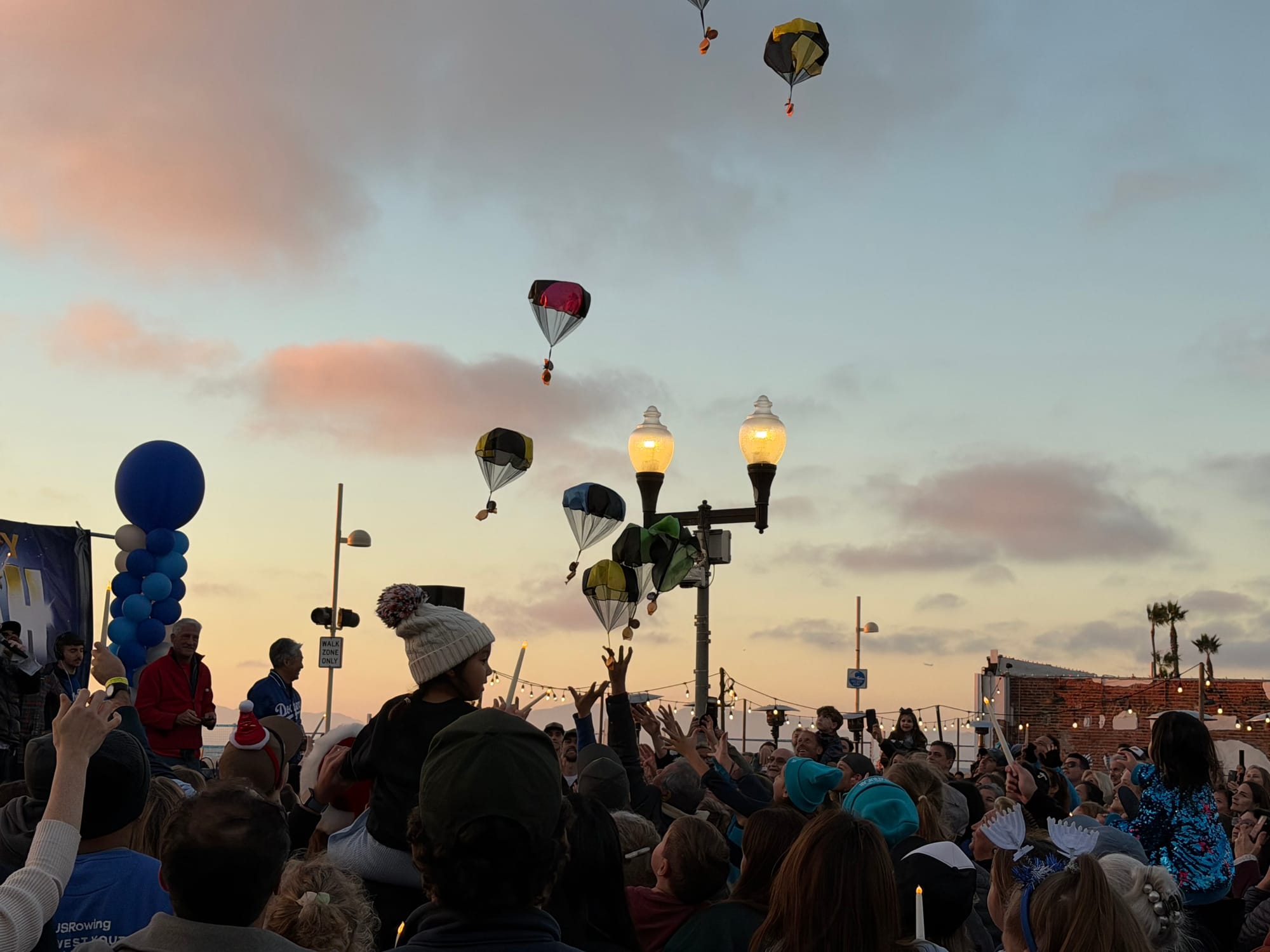 The celebration included free donuts and latkes, symbolizing the miracle of the oil that burned for eight days; a performance by local children; the 'gelt drop' with chocolate coins on small parachutes tossed from a fire truck ladder, and of course the menorah lighting ceremony.