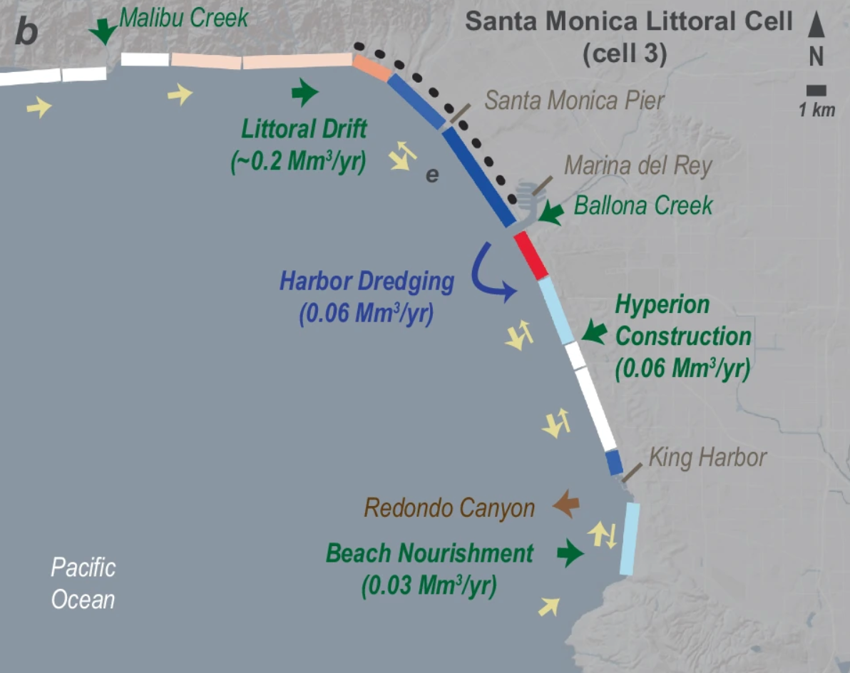 He also identified two major historical contributors to Hermosa's sand supply: the construction of Marina del Rey, whose jetties trap enormous volumes of northerly sediment, and the construction of the Hyperion Treatment Plant, whose excavation of coastal bluffs deposited large quantities of material onto nearby beaches, which then moved down the coast. "I would say that probably a bigger influence on your long-term record would have been the Hyperion construction," Sanders said. "I think those two projects delivered large volumes of sand into the region."