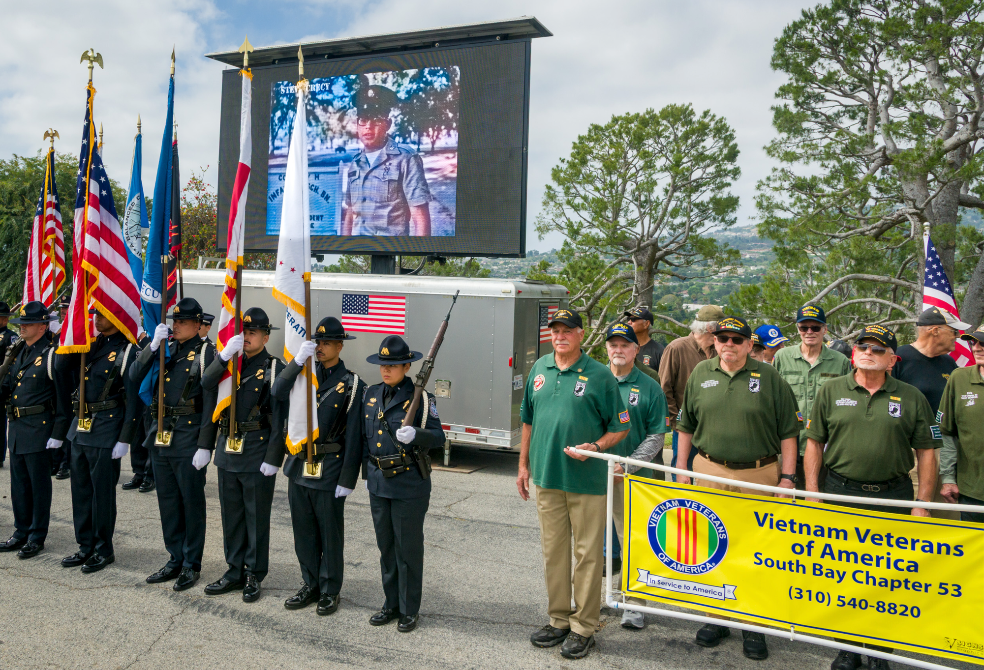 From Top: (1) Vietnam veteran Steve Crecy with his squad leader Jeff Ferguson at Camp Bearcat in South Vietnam in 1968. (2) Crecy with a fellow soldier at Camp Bearcat is South Vietnam in 1968. (3) Crecy with fellow Vietnam Veterans of America, South Bay Chapter 53, at the Green Hills Memorial Day Observance on May 26, 2025. On screen, a photo of Crecy at the Army Radio School in Georgia in 1967. (4) Vietnam veteran Mike Flaherty while serving as a Marine in Da Nanag, 1967.(5) Mike Flaherty with former Community Resources Director Mary Rooney one day before the dedication of the Veterans Memorial in May 1994. (6) Hosing down the walkway near the Hermosa Beach Veterans Memorial, as part of the monthly maintenance.