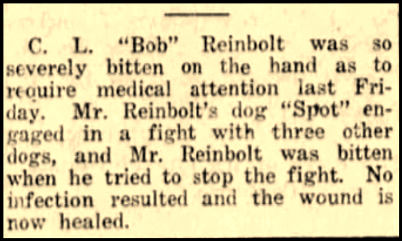 Even the dog got in on it. Reinbolt's dog Spot got into a fight with three other dogs. Reinbolt waded in to break it up and was bitten on the hand badly enough to require medical attention. No infection resulted.