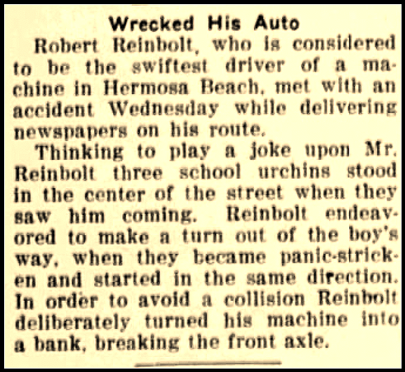One report described him as "the swiftest driver of a machine in Hermosa Beach." On that occasion, three schoolboys stood in the middle of the street to play a joke on him. When Reinbolt swerved to miss them, the boys panicked and ran in the same direction. To avoid a collision, he deliberately turned his car into a bank embankment, breaking the front axle.