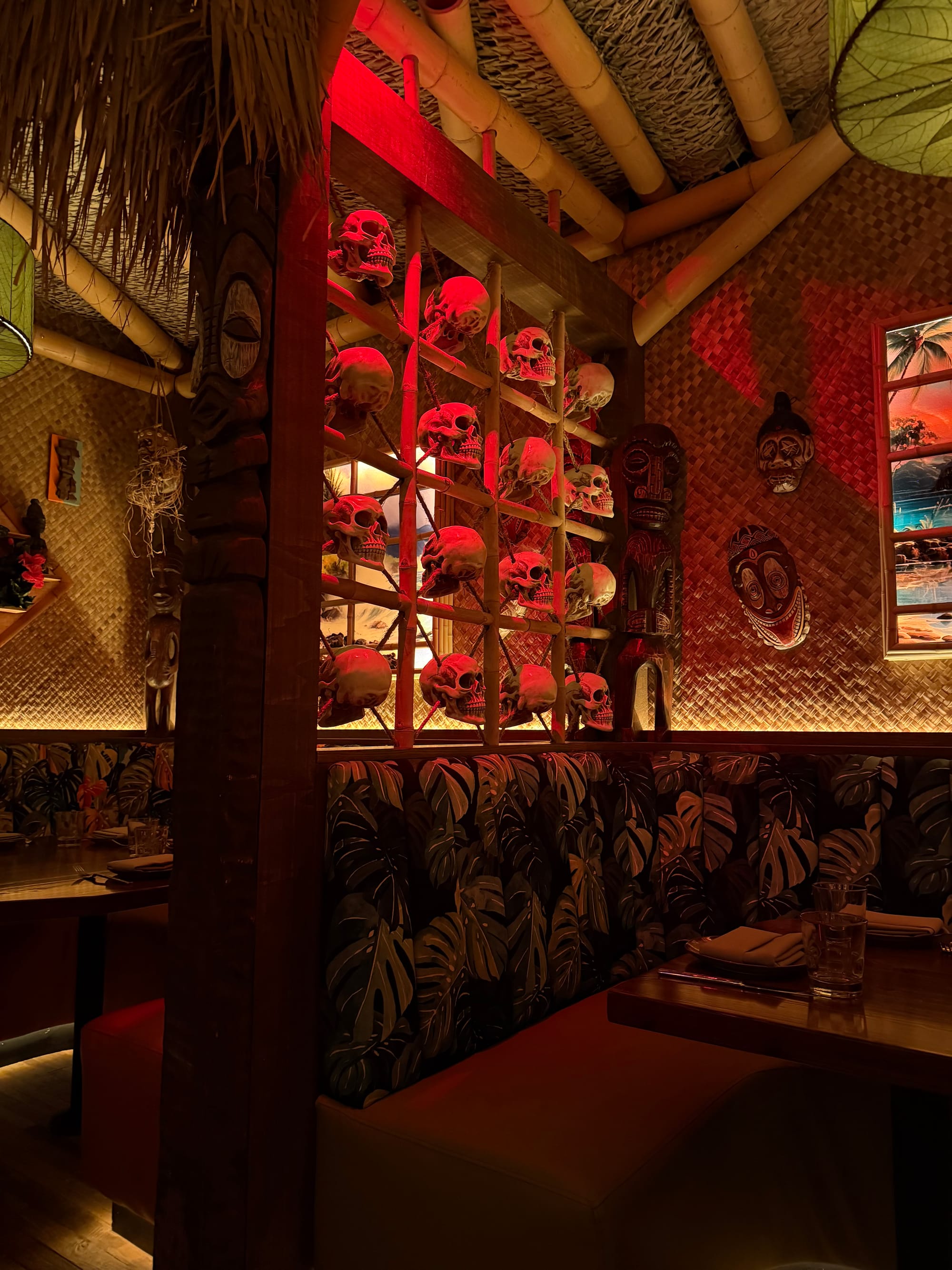 The space announces its intentions with real drama. A massive hand-carved tiki door guards the entrance, and inside, skull-dominated decor and elaborate wood carvings create an immersive environment so committed to theme that the space would require complete demolition to become anything else now. A myriad of lanterns cast dim, atmospheric light across lava rock walls adorned with carved tikis, tropical curios, and thatched-hut booths. The windowless design deliberately blocks out the Plaza beyond, transporting diners to an island fantasy. And those skulls...lots and lots of skulls.